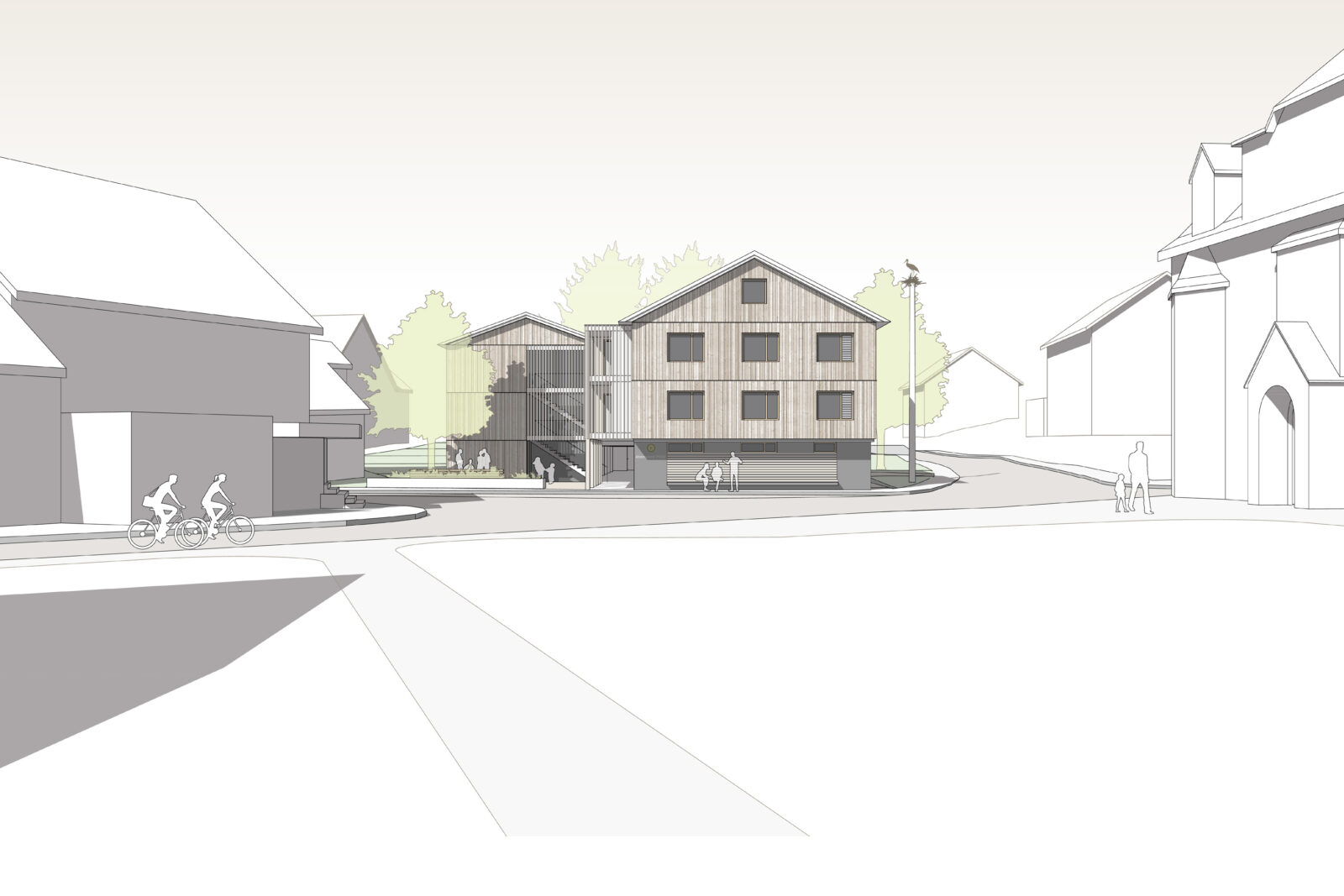 Mit vertrauten Proportionen und Gebäudestellung ergänzt der Neubau den Ort im Sinne eines kohärenten Ortbildes mit einem selbstverständlichen und unaufdringlichen Stadtbaustein.