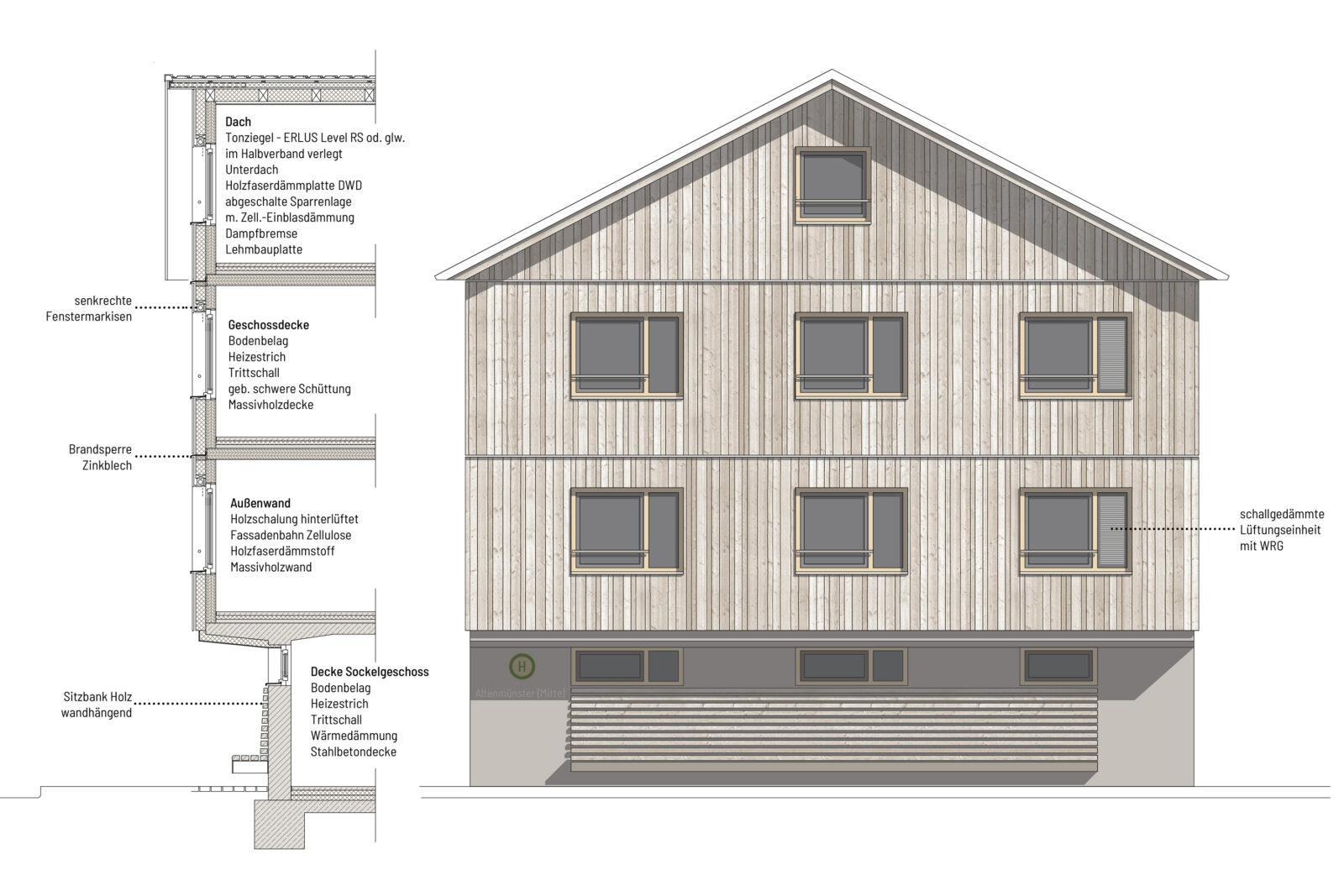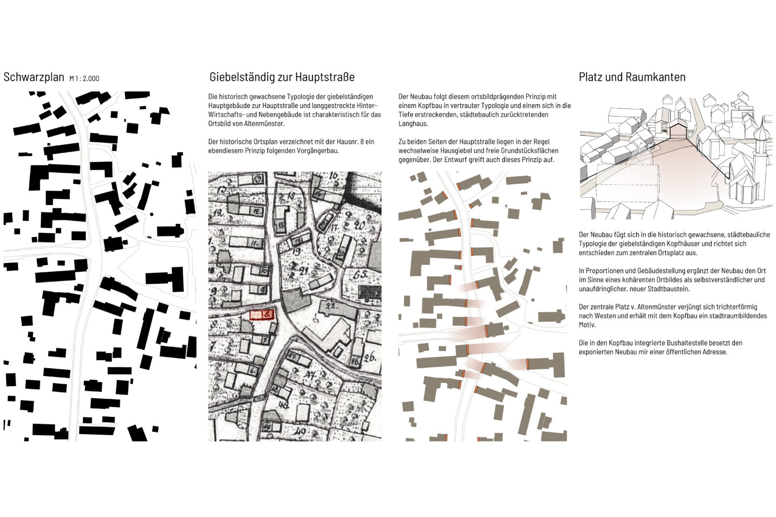 Der Neubau fügt sich in die historisch gewachsene, städtebauliche Typologie der giebelständigen Kopfhäuser und richtet sich entschieden zum zentralen Ortsplatz aus.
