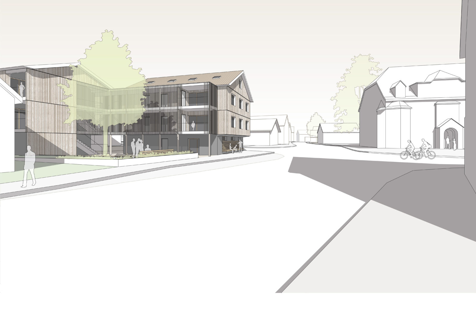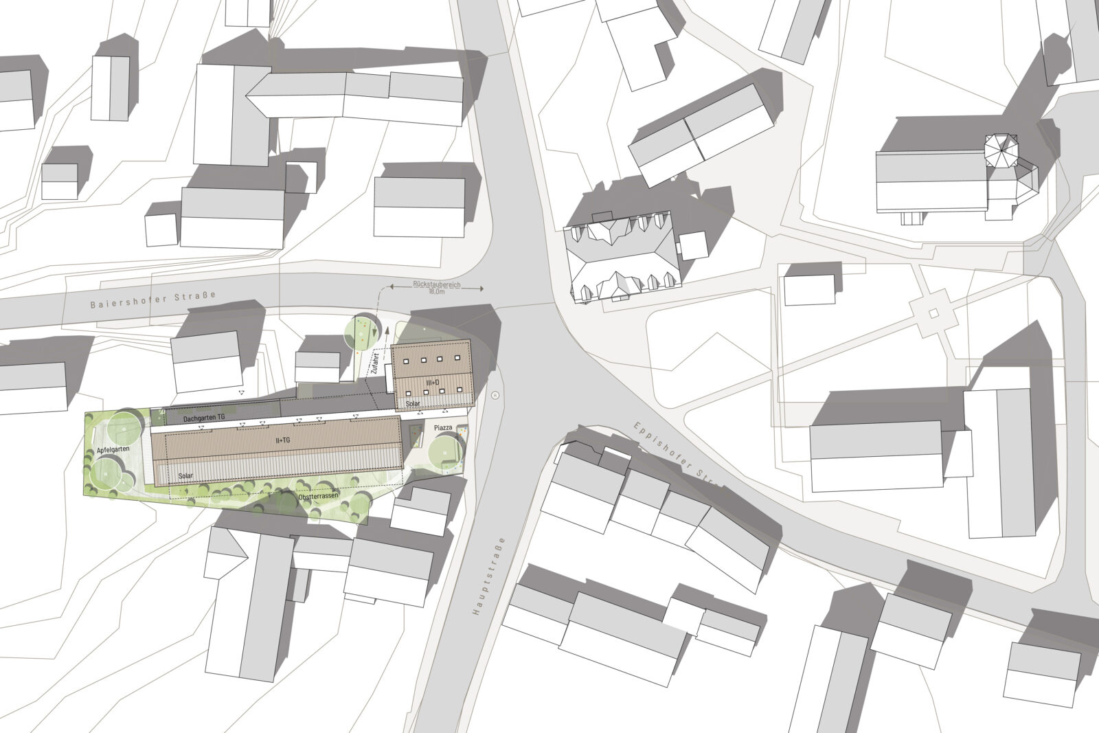 Der Neubau folgt diesem ortsbildprägenden Prinzip mit einem Kopfbau und einem sich in die Tiefe erstreckenden, städtebaulich zurücktretenden Langhaus.