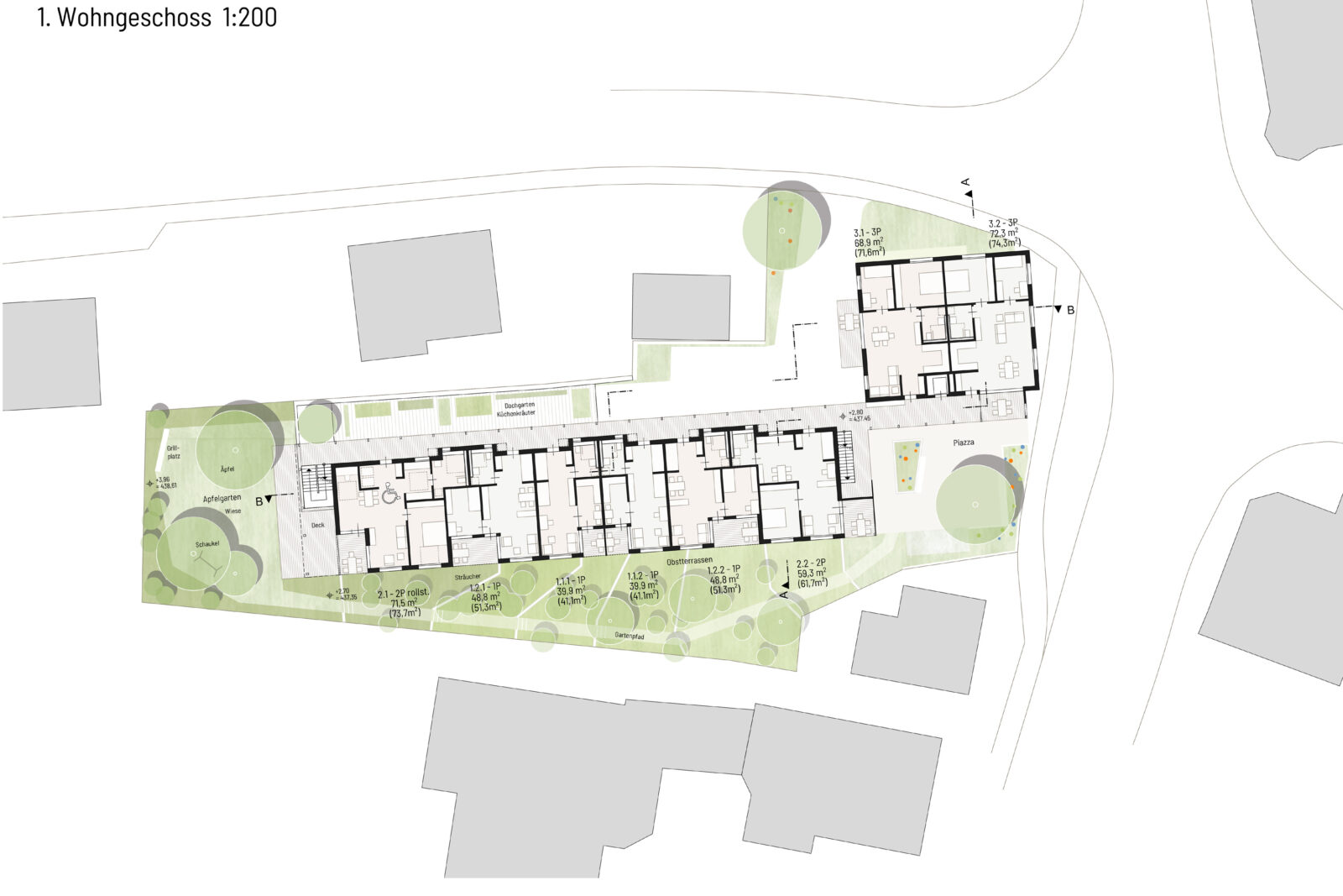 Zwischen den Freiräumen der „Piazza“ und des Apfel- und Familiengartens spannt sich das Langhaus auf und wird von kleinflächig untergliederten Grünflächen flankiert.