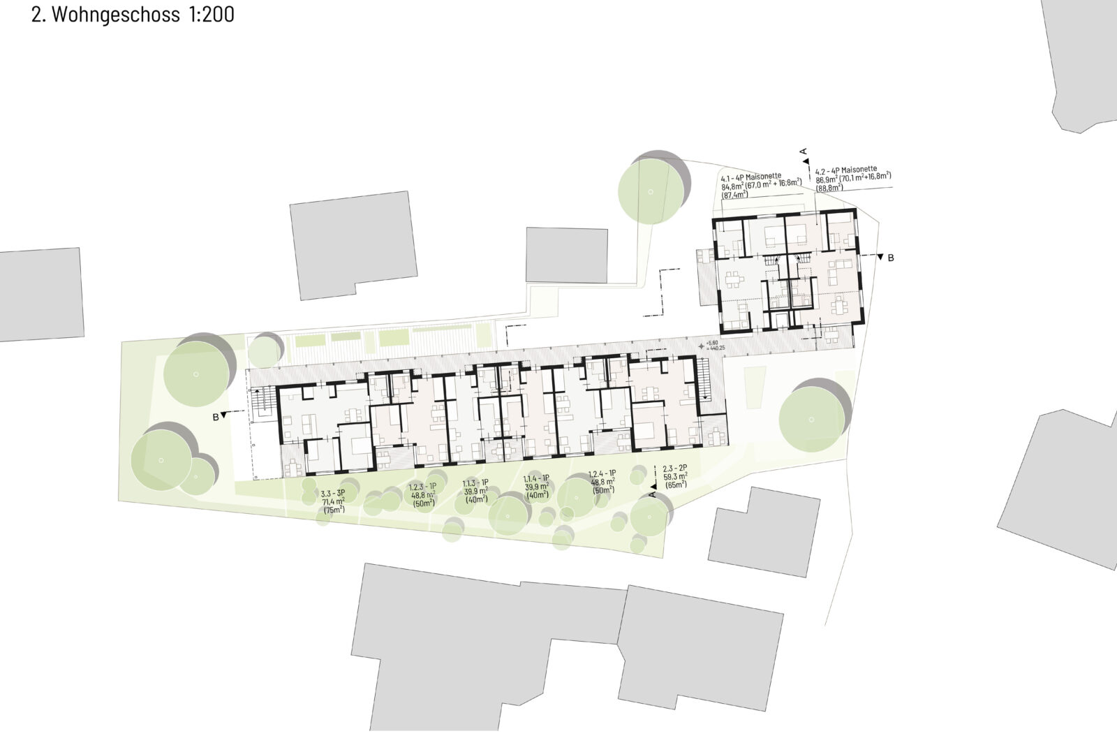 Es werden insgesamt 16 Wohneinheiten gemäß vorgegebenem Wohnungsmix in zwei Gebäuden untergebracht.